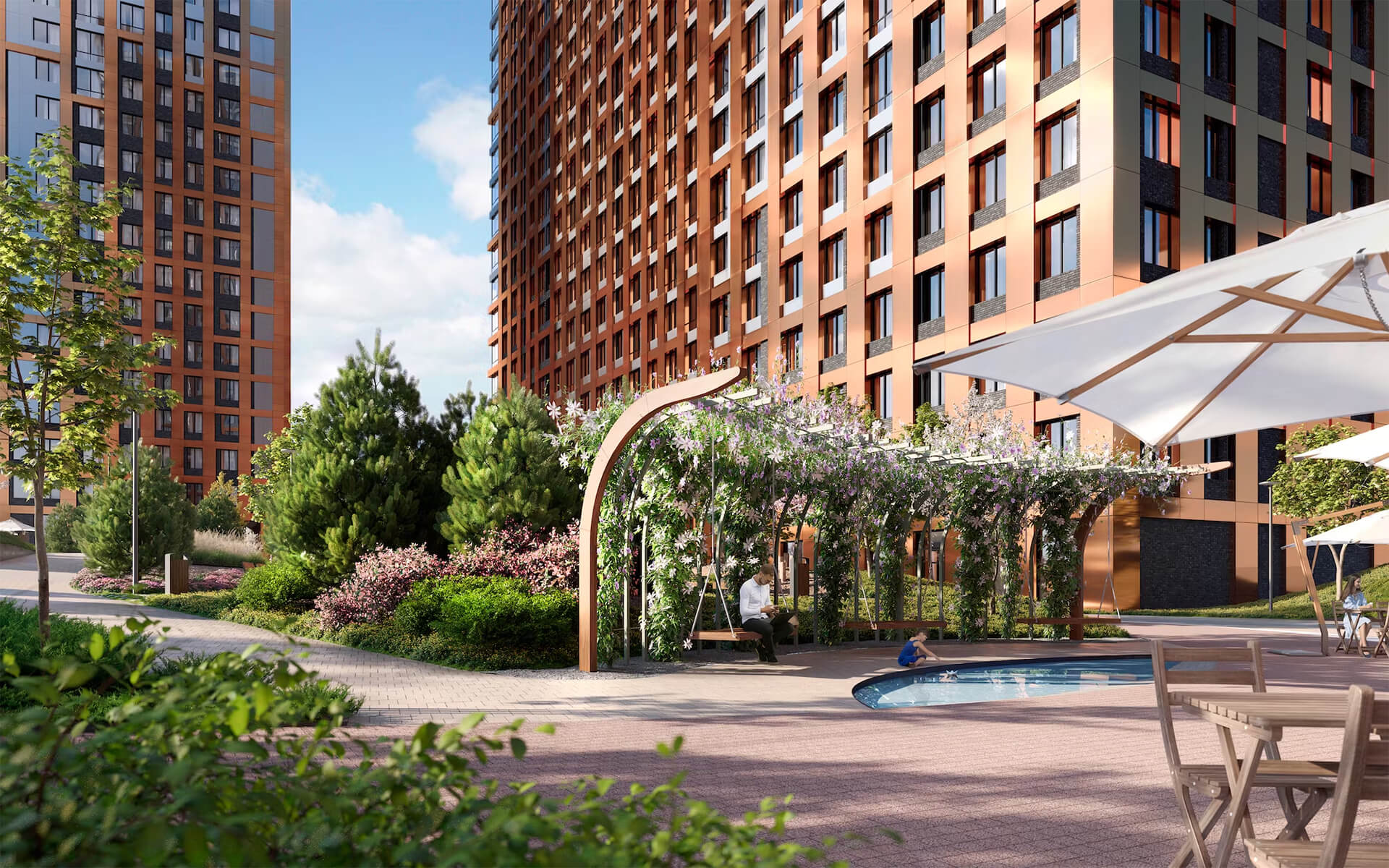 Территория жилого комплекса «Сидней Сити» — гармоничное сочетание природы и современной городской среды, где каждый элемент продуман для комфорта, эстетики и функциональности. Здесь создано уютное пространство, которое становится идеальным местом для отдыха, прогулок и общения.